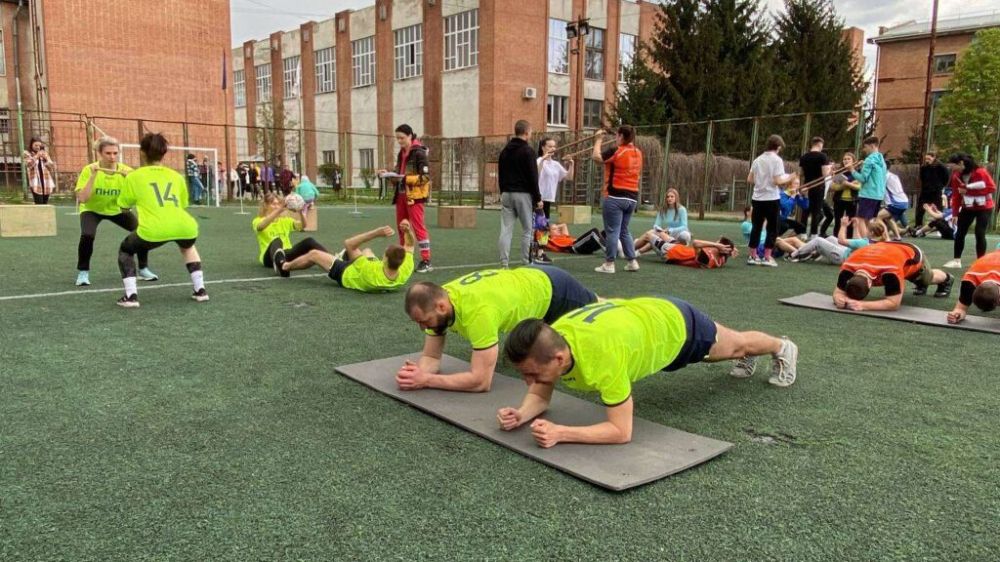 Після невеликої розминки, яку провела завідувачка кафедри Оксана Корносенко, розпочалися спортивні баталії. Перший етап змагань передбачав виконання вправ поточним способом: ривок диску вгору з напівприсідання, настрибування на тумбу, жим грифу вгору, бьорпі, стрибки зі скакалкою, згинання та розгинання рук в упорі лежачи. Обов’язковою умовою змагань була участь не менше двох осіб жіночої статі в команді. Дівчата виконували такі ж вправи, але з меншою вагою. На другому етапі команди виконували вправи парами, що дозволило об’єднати молодь духом співпраці, взаєморозуміння та товариськості. Етап передбачав виконання вправ круговим способом по 40 сек. на кожній станції. Вправи були такими: піднімання тулуба в сід з передачею м’яча партнеру, присідання з виштовхуванням гімнастичних палиць вгору, низька планка. З усіма вправами спортсмени впоралися на відмінно!