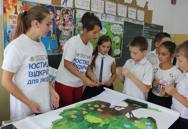 Захоплення малечі також викликали загадки на правову тематику. Наостанок закріпити отримані на уроці знання допомогло завдання «Правове дерево» з листочками різних кольорів: синіми листочками-правами дітей і жовтими листочками-правилами поведінки вдома та у суспільстві. Також співробітниками юстиції наголошено, що право охороняється і забезпечується державою і всі діти рівні у своїх правах.